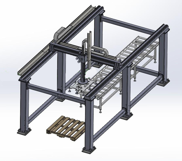 LT-XYZ型龍門桁架式碼垛機、碼垛設(shè)備,占地面積小,能耗少,可將套袋后的5加侖桶或產(chǎn)品裝箱后的紙箱4個一組碼垛在托盤上,滿16個成一層,按客戶要求可以碼垛2-6層,只需一個人可輕松完成本碼垛工作。無動力自動進桶——滾輪,由接近開關(guān)信號檢測,無桶/箱或不滿4個工位不工作。升降及平移采用直線式軸承滑動,由伺服電機驅(qū)動,提桶、放桶位置準(zhǔn)。采用PLC和觸膜屏聯(lián)合控制方式,運行參數(shù)及動作過程可在觸膜屏上自行調(diào)節(jié);具有故障報警、顯示、故障停機等功能。